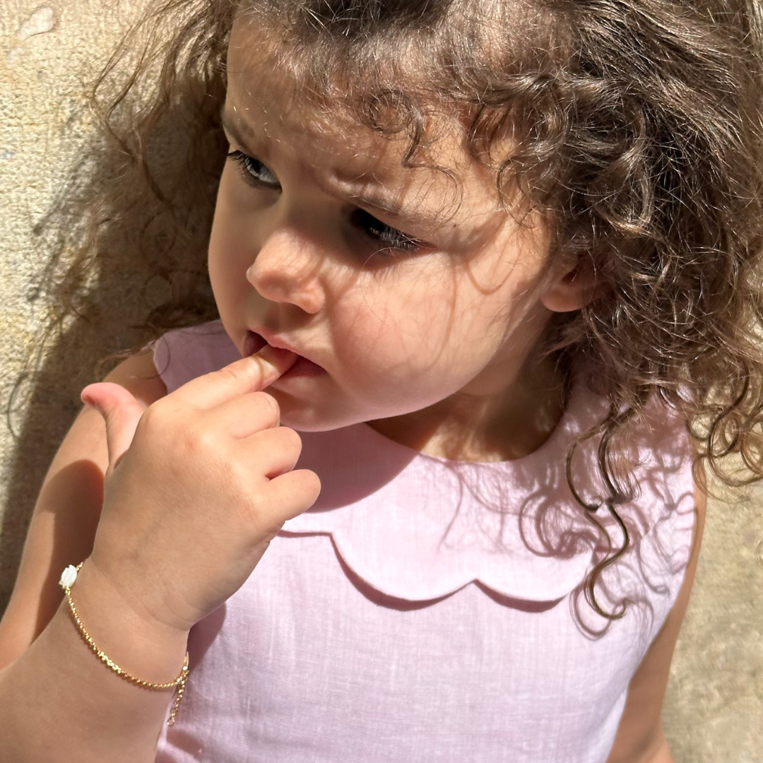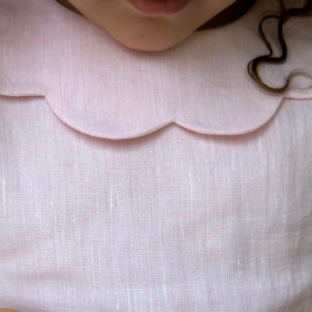 Robe habillée pour enfant en lin rose, alliant légèreté et raffinement. Son col délicat en forme de pétales de fleur apporte une touche poétique, tandis que les épaules dénudées dessinent une silhouette gracieuse et aérienne. Confectionnée dans un lin doux et naturel, cette robe est idéale pour les journées estivales ou les moments spéciaux.